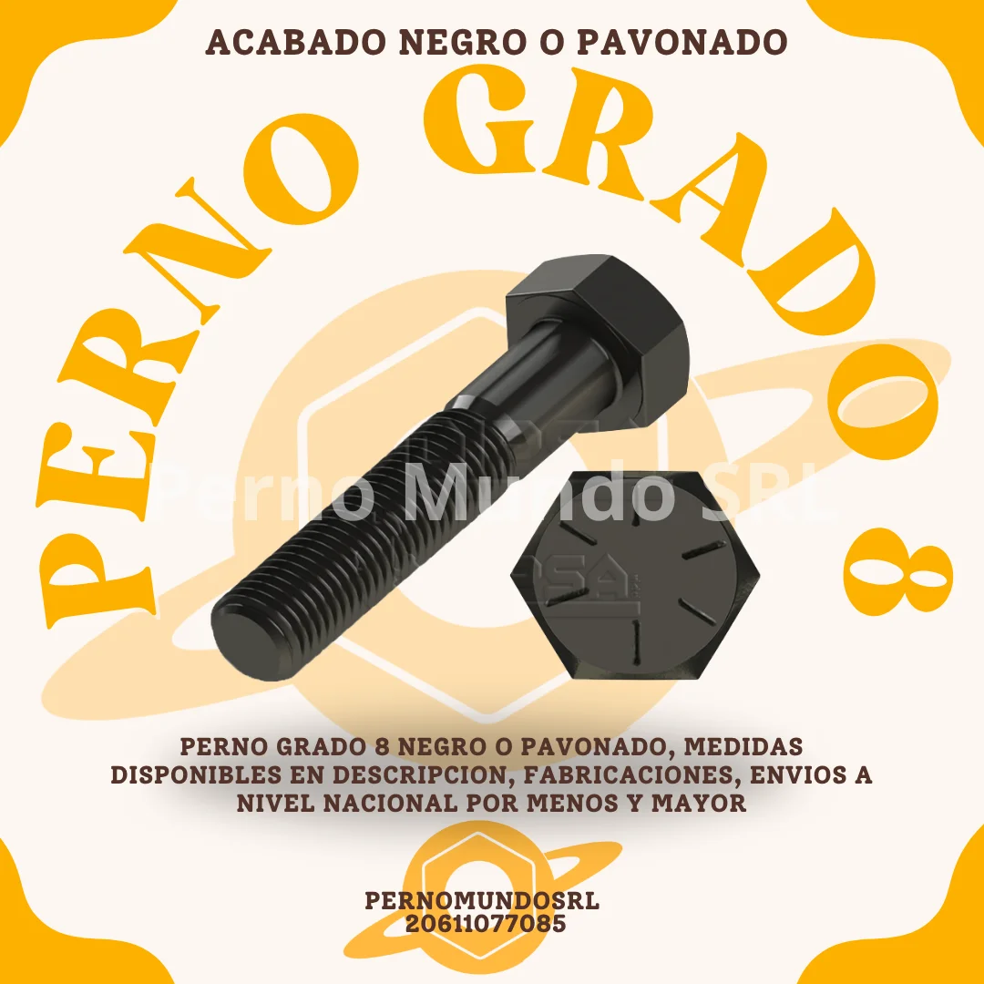 Los pernos hexagonales Grado 8 en acabado negro son elementos de fijación de alta resistencia, fabricados en acero aleado bajo normas SAE J429. Están diseñados para soportar grandes cargas y esfuerzos mecánicos, especialmente en maquinaria pesada, automotriz, construcción e industria minera.